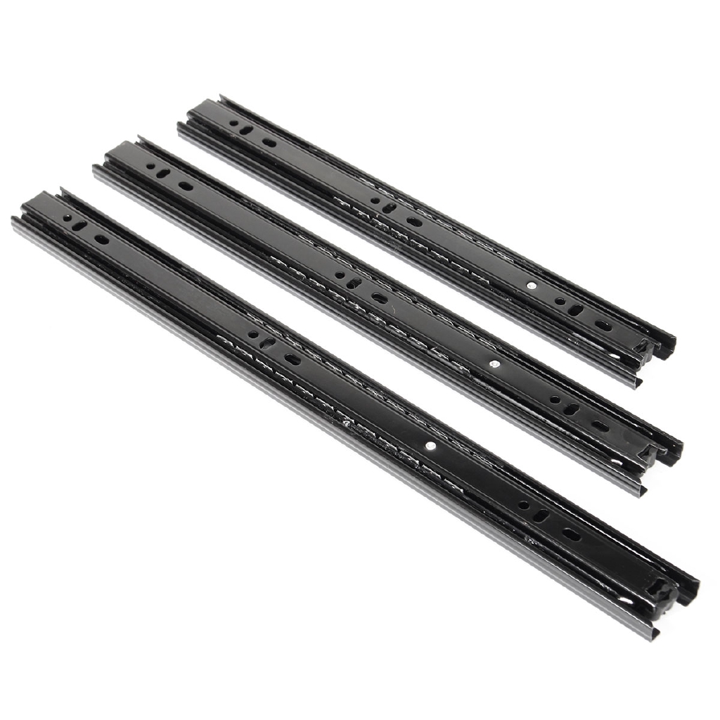 The slides are 22'' long but can be cut to length if needed. The cabinet that we are installing pull out shelves in has bumpers on the door, we are going to leave them on so that we do not get banging of the door against the frame when we are finished. Remove all racks from inside the oven. Place the drawer on the countertop above the drawer opening. Look for these on a cabinet drawer with full e.